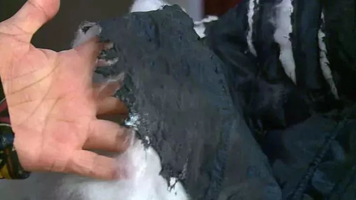 消防队员介绍,如果这件羽绒服穿在人身上,接触到含有油脂的皮肤,其燃烧速度可能会更快:“如果羽绒服穿在身上,着火了,人一跑动,产生风,也会加速衣服的燃烧速度。”