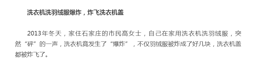 此外,羽绒服在高速甩干过程中与洗衣机内胆摩擦引起静电也可能引发“爆炸”。
